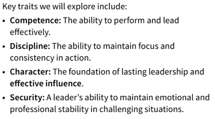 Leadership is revealed in your habits, competence builds trust, discipline sustains it, character anchors it, and security empowers it.